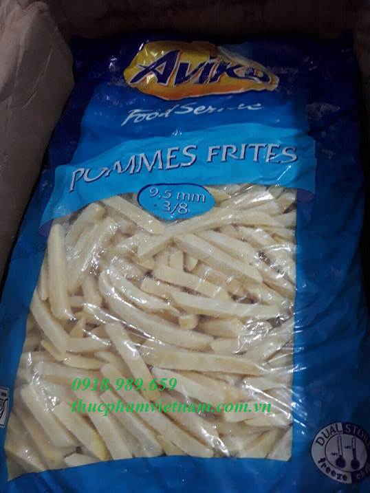 Khoai tây Aviko loại Pomesfries có kích thước 9.5mm, đóng gói túi nhỏ 2.5kg thùng 10kg.