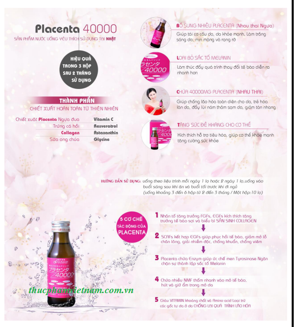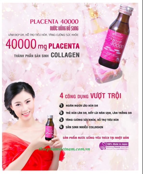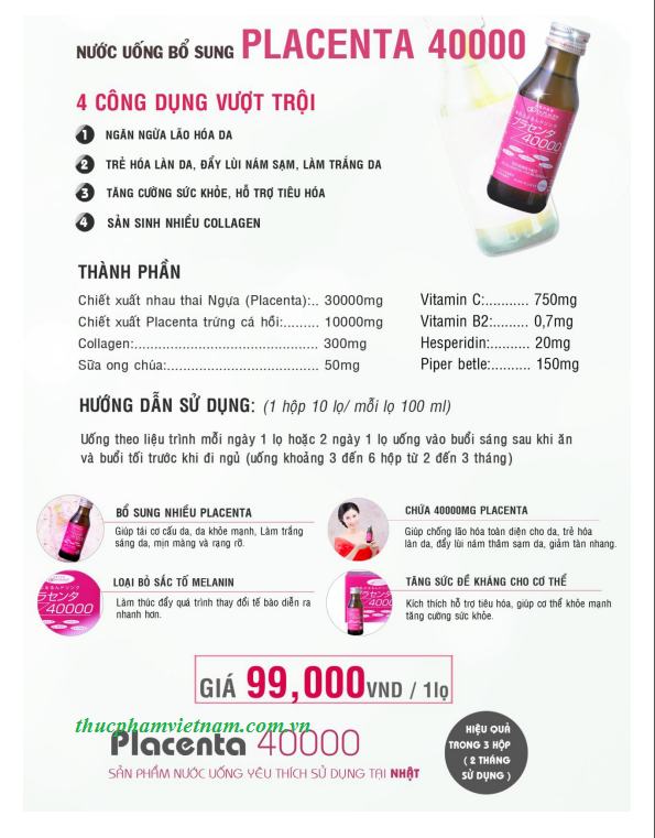 PLACENTA 40000 là loại dạng nước uống bổ sung, làm đẹp da, hỗ trợ tiêu hóa tăng cường sức khỏe cho con người. Loại nước uống này chứa 40000 mg placenta là thành phần sản sinh ra collagen. Được chiết xuất từ màng bọc trứng ca hồi, sữa ong chúa, collagen, sữa, vitamin C, glycine, trầu không...